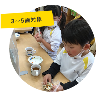 プランターでの野菜作り、お弁当を持って外で食べるピクニックランチ、バイキング給食、クッキングなどを食育活動として行います。食への興味を高め、感謝の心を養い、みんなで食事を楽しむことを目指します。