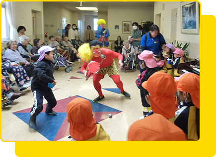 近隣の特別養護老人ホームに毎年3回程お邪魔して、運動会や発表会の演目を披露したり、一緒に季節の歌を歌ったりして交流させて頂いています。 今年度は節分で豆まきを一緒にやりました。子どもたちは保育園で自分たちで作った升を手におじいちゃん・おばあちゃんたちと一緒に力を合わせて鬼退治をしました。優しいおじいちゃん・おばあちゃんと触れ合う中で、思いやりの気持ちや安心感、コミュニケーション等、様々な面が育って欲しいと思います。