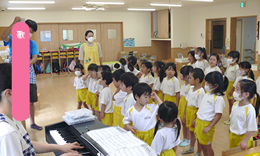 今月の歌、季節の歌、子ども達の好きな歌。様々な歌を毎日歌います。 音楽に親しみ、情緒を育てます。